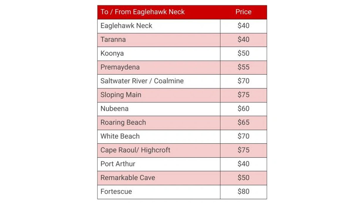 Cost from Hobart CBD to Waterfall Bay Carpark for 1-4 People = $280 total